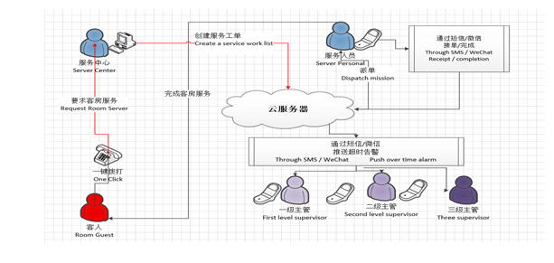 为了更好的满足客人的需求,提高酒店服务品质,酒店客房服务呼叫中心(简称Romm CC)有效的解决了客人的需求。即客人只需在客房话机上按一键“客房服务电话”号码,就可以得到自己所需的服务。为了达到这个服务理念,必须对客人提出的服务进行有效的管理监督,从客人提出需求到服务结束,可以进行全程进行管理监督,以达到提升服务品质、效率以及实现零投诉和无差错的服务目标。
