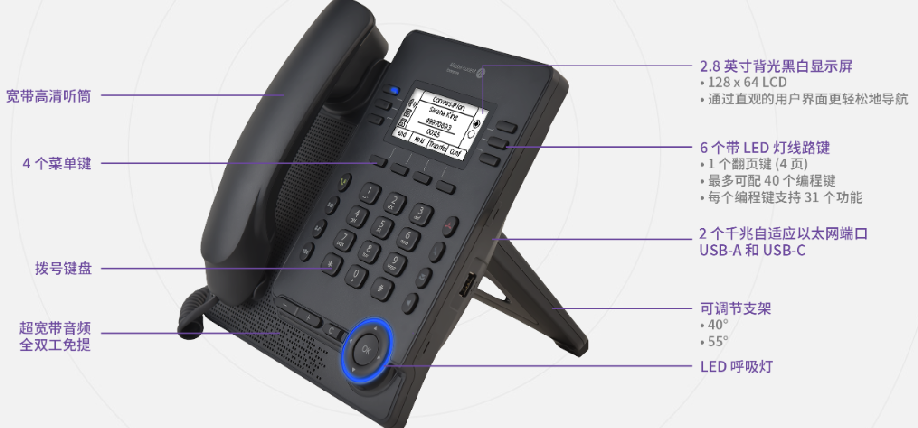 企业级黑白屏IP话机。搭配超宽带音频为客户带来无与伦比的通话体验。Myriad系列支持高级商务话机功能,配置有6个线路键配指示灯和4个快捷菜单键。界面清晰直观,易于操作,支持录音,配置有清晰简明的功能键以及四维方向键。
