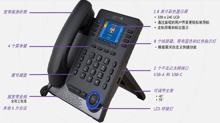 M8 话机选用 5 英寸彩色 IPS 显示屏,配合可调节角度支架,给客户带来绝佳的视觉体验。话机延续了阿尔卡特朗讯桌面话机时尚大气的外观设计,全触摸的功能按键和布艺出音孔,完美兼容居家、办公等 多种使用场景。话机的超宽带技术,带来更佳的音频效果,捕捉更多声音细节,使沟通宛如身临其境。