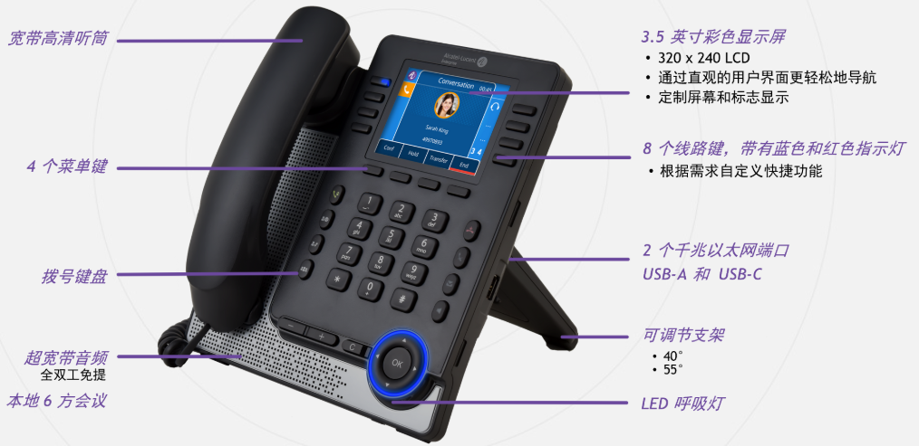 中端企业级 SIP 话机,配备 2.8 英寸高清彩屏,支持屏保定制;具有超宽带音频、直观现代的用户界面和丰富的电话功能,提供无与伦比的通话体验。话机管理便捷,可通过网页端、ALE 设备管理平台 EDM 及 ALE 重定向平台 EDS 进行批量配置及部署,提高运维效率
