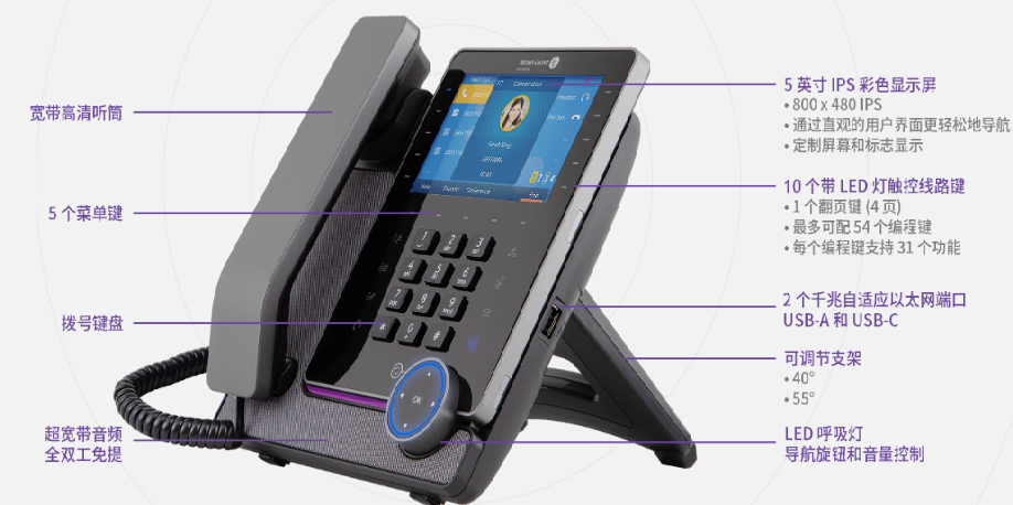 8、功能:呼叫保持、静音、免打扰、转移、等待、速拨、热线、12方会议、重拨、回拨、自动应答、支持VAD、EAC、HAC等;支持霍尔传感挂机,支持蓝牙5.0连接蓝牙耳机/手机、支持手动/自动录音本地U盘存储和上传、多达54个可编程键,支持EHS耳机;支持外接扩展台最大扩展600扩展按键;